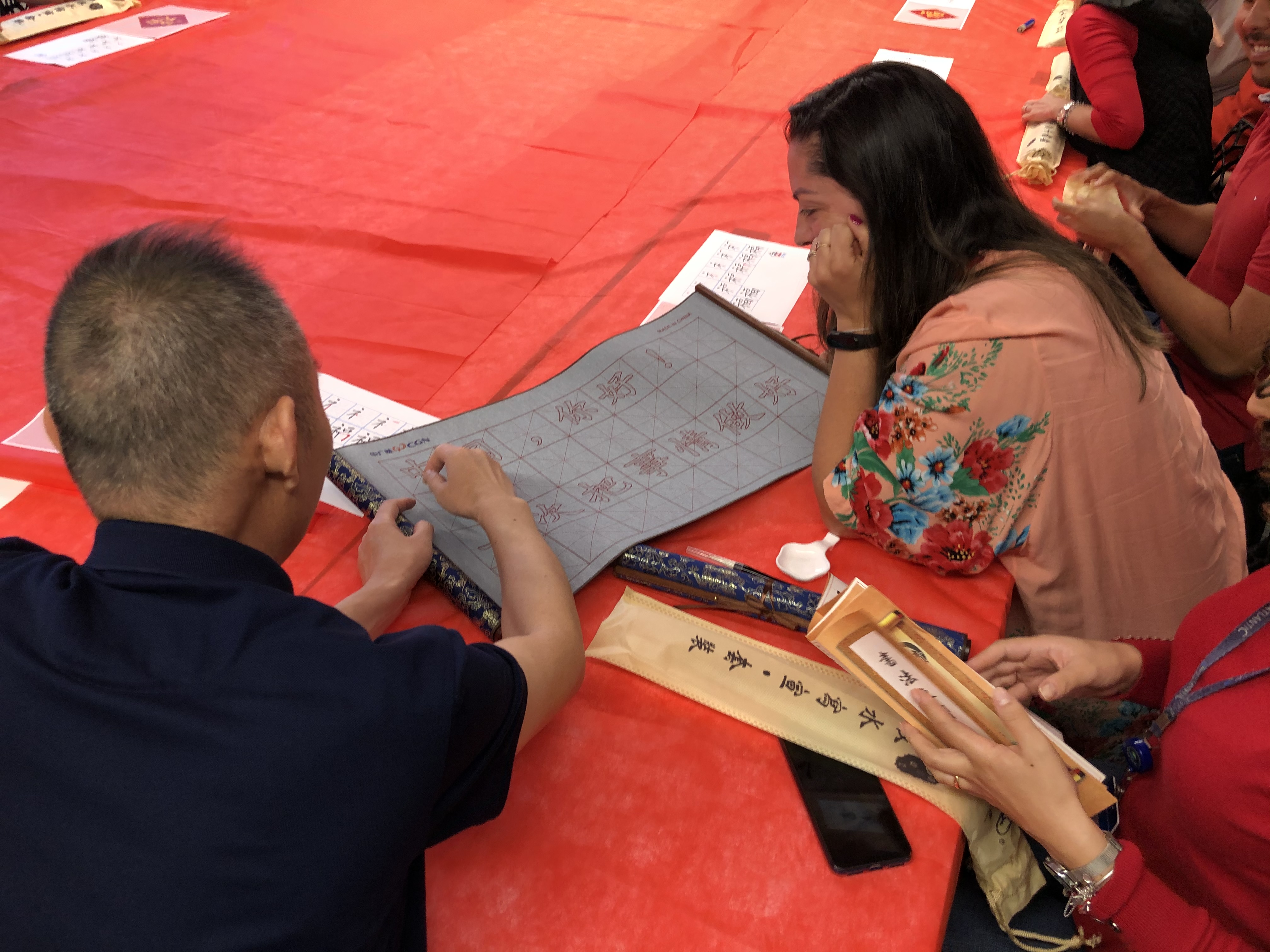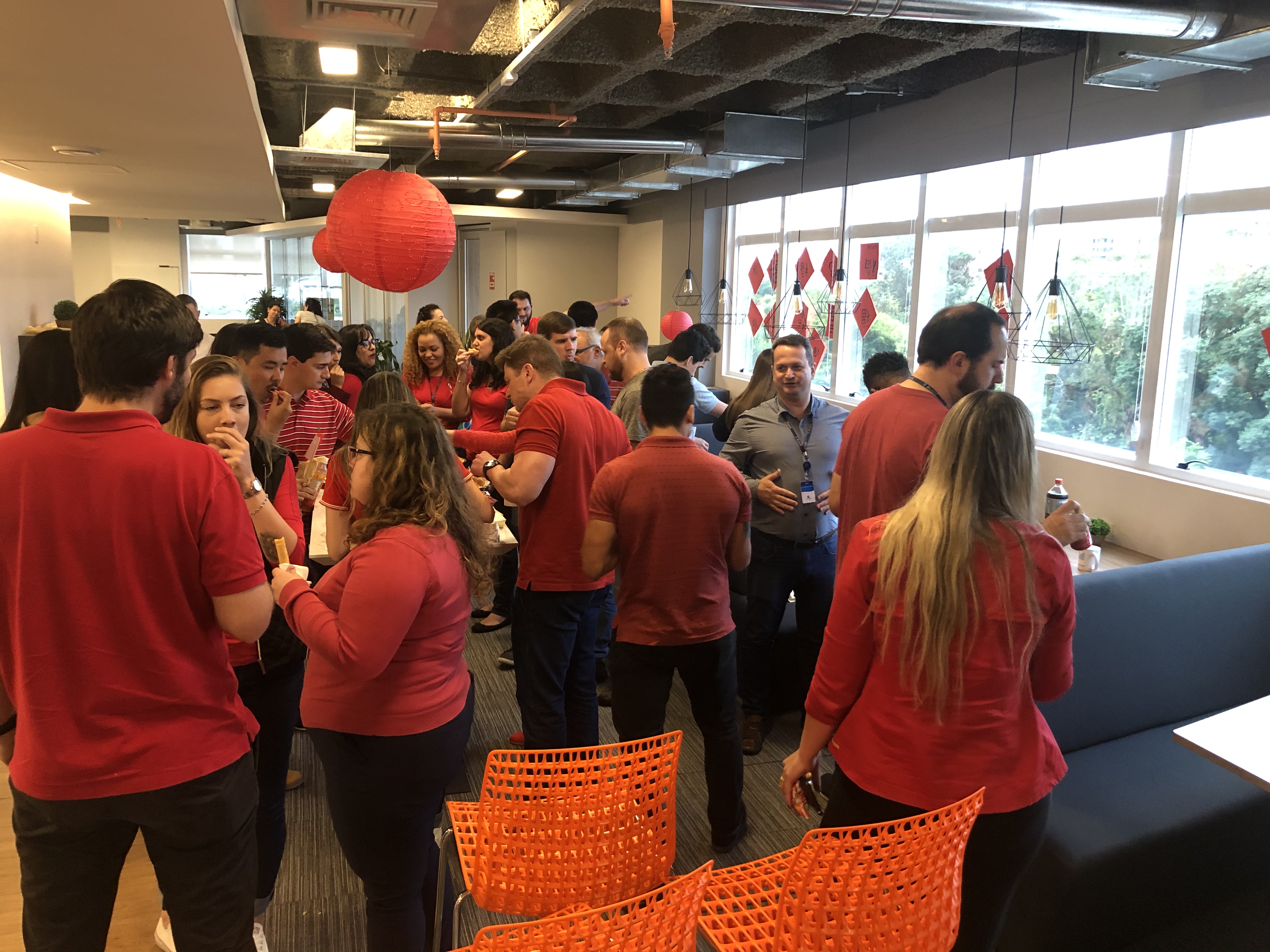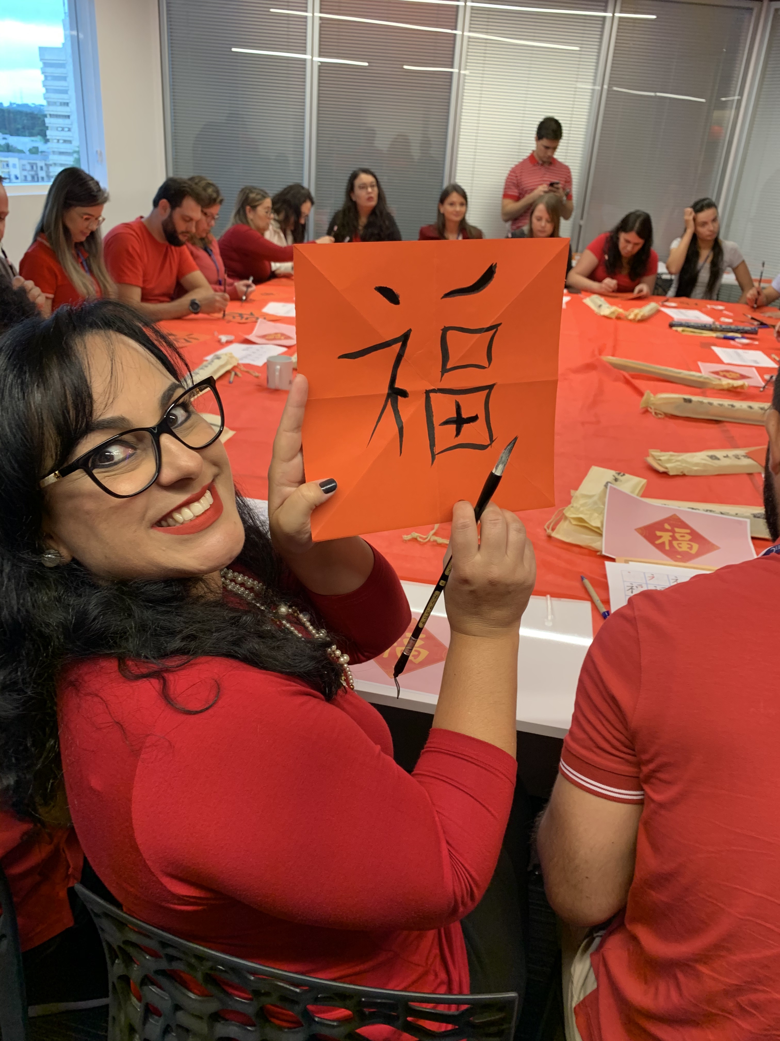 2020年1月17日,巴西公司組織“新春送?!被顒?。圖為員工們展示作品合影。