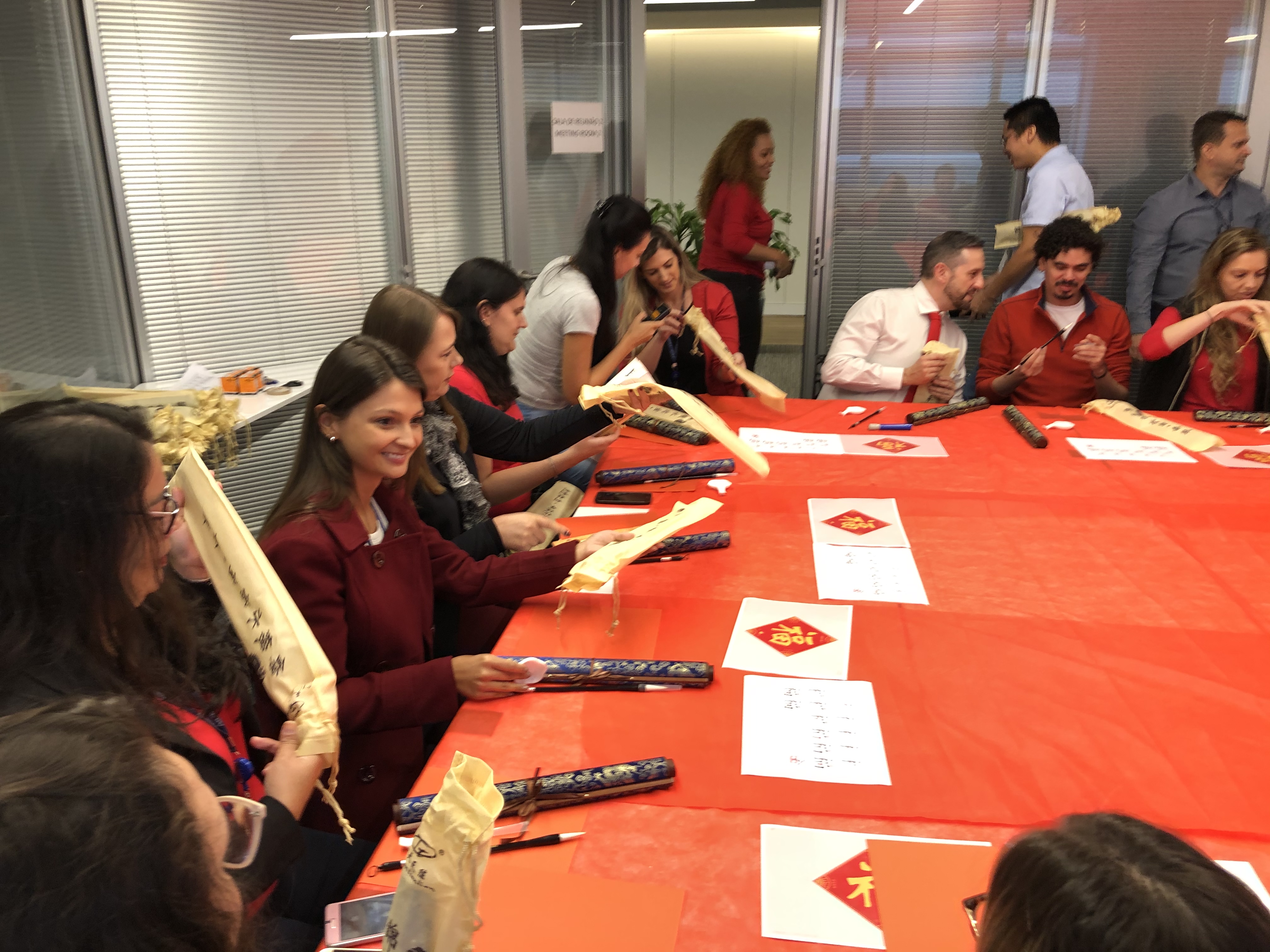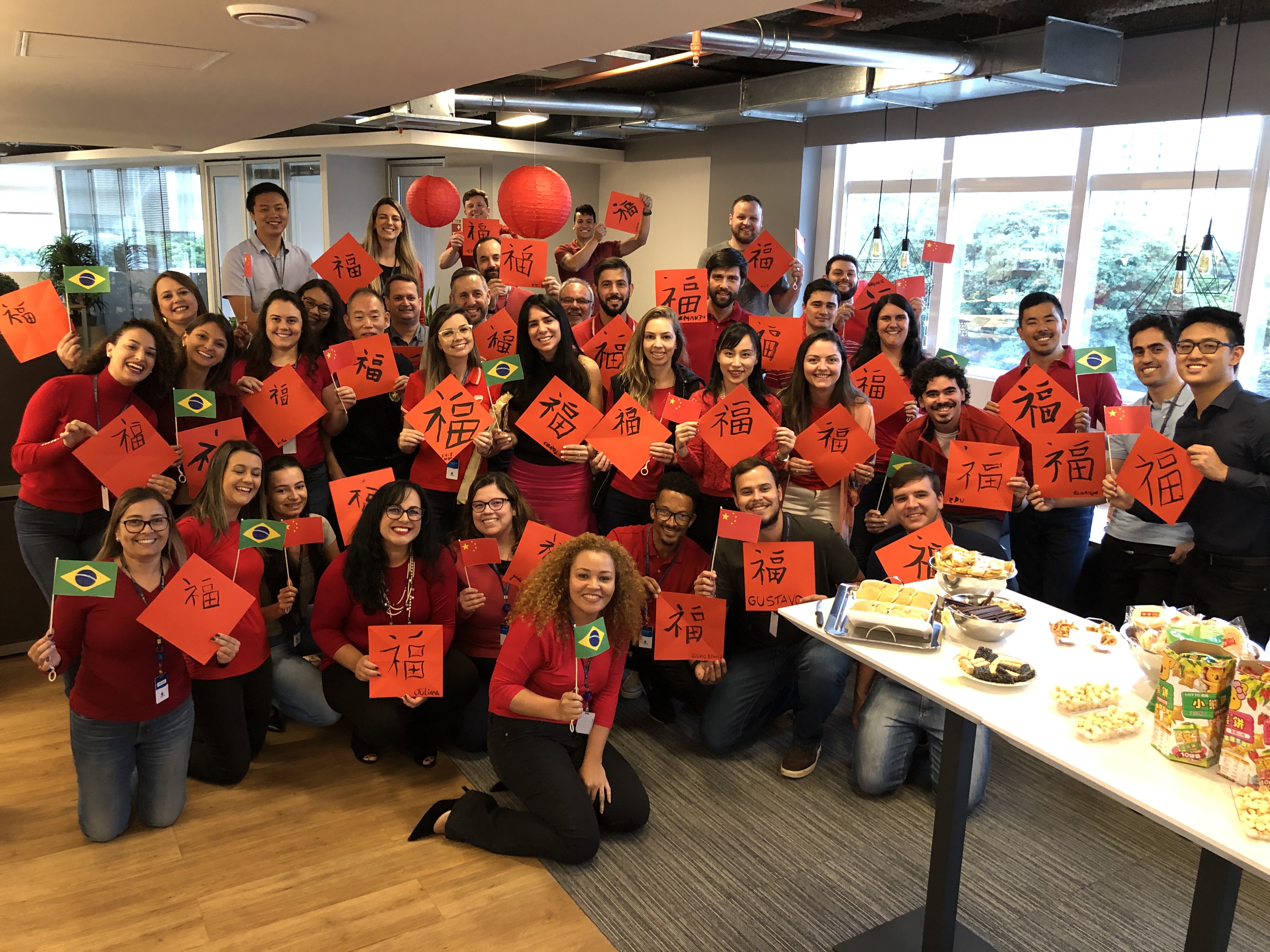 2020年1月17日,巴西公司組織“新春送?!被顒?dòng)。圖為員工們展示作品合影